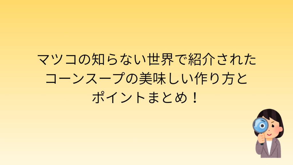 マツコの知らない世界でコーンスープ特集が放送され、コーンスープの名店や進化しているインスタントのコーンスープなどが今話題になっています。 その特集の中では市販のコーンスープを2倍美味しくする作り方なども紹介されており、すぐマネできる嬉しい... -