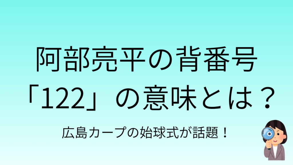 2026年3月27日にSnowManの阿部亮平さんが広島カープの開幕戦の始球式に登場しました。 マウンドでは素晴らしい投球を披露した阿部さんですが、身につけていたユニホームの背番号「122」の意味も気になりますよね。 そこで今回は阿部亮平さんの始球式の様子... -